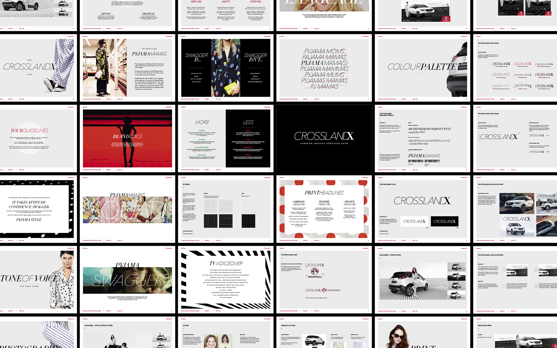 Defined the visual identity for the 'Pyjamamamas' campaign, establishing the core art direction, typography, and layout principles. Authored the 48-page brand guidelines and co-wrote the photography brief for Rankin, ensuring a cohesive launch for the new SUV across all marketing channels.